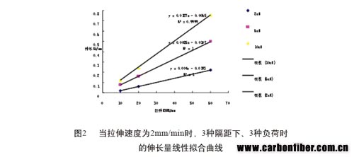 從圖2可以看出,在拉伸速度為2mm/min下,拉伸負(fù)荷分別達(dá)到2cN、6cN、10cN時(shí),拉伸隔距和測(cè)試結(jié)果的伸長(zhǎng)量為線(xiàn)性關(guān)系。