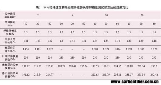最后可以根據(jù)線(xiàn)性回歸后的分析結(jié)果,對(duì)測(cè)試讀出的數(shù)據(jù)進(jìn)行修正。將系統(tǒng)受力產(chǎn)生的伸長(zhǎng)量剔除,得到碳纖維真正的伸長(zhǎng)率和模量等力學(xué)指標(biāo),見(jiàn)表3。