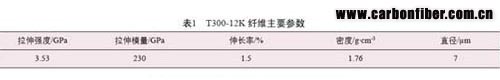 試驗(yàn)采用市售商品日本東麗公司聚丙烯腈( PAN) 基碳纖維,牌號(hào) T300B-12K,簡(jiǎn)稱(chēng) T300,它是國(guó)際公認(rèn)的通用級(jí)標(biāo)準(zhǔn)碳纖維,性能參數(shù)見(jiàn)表1。